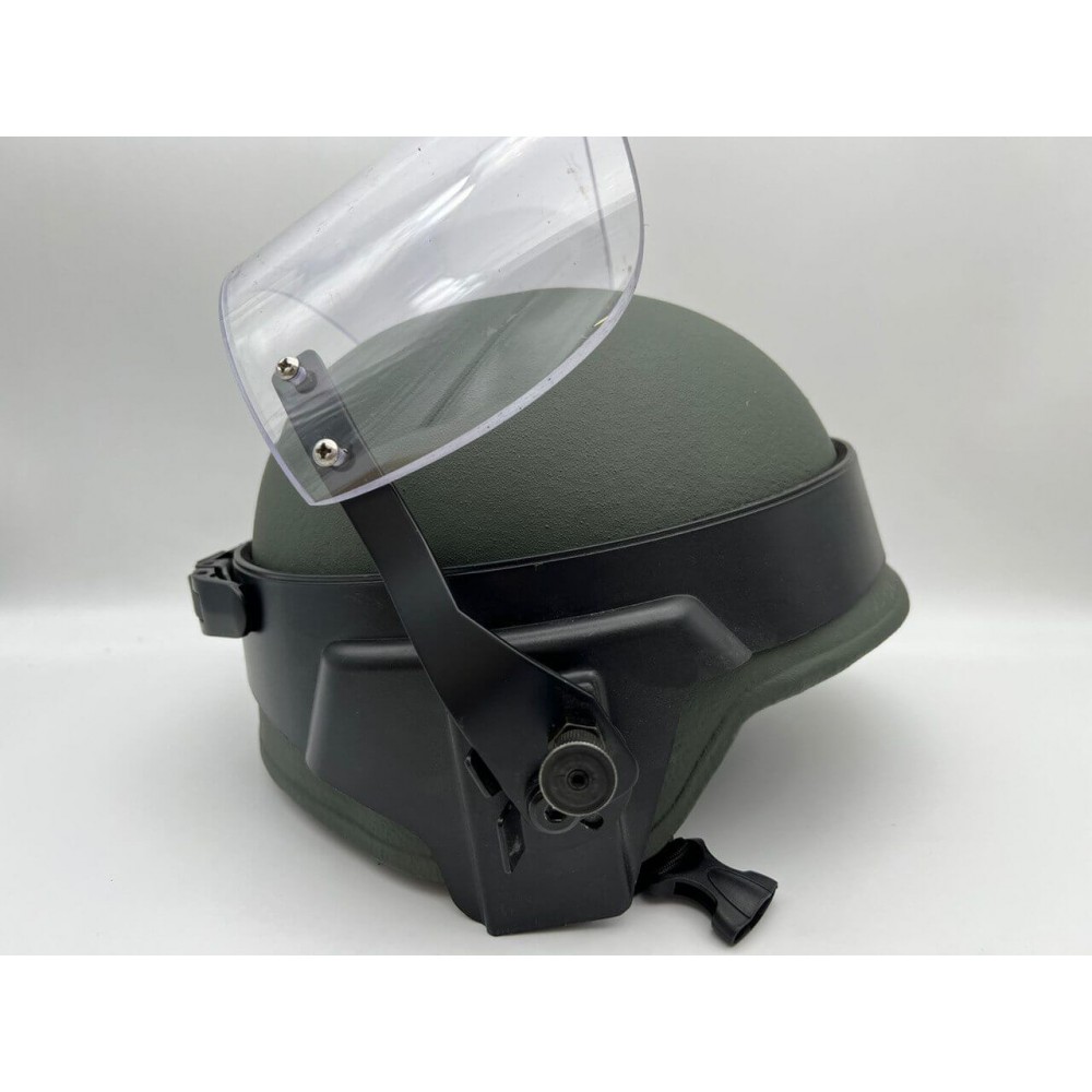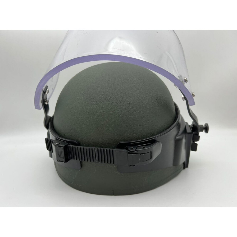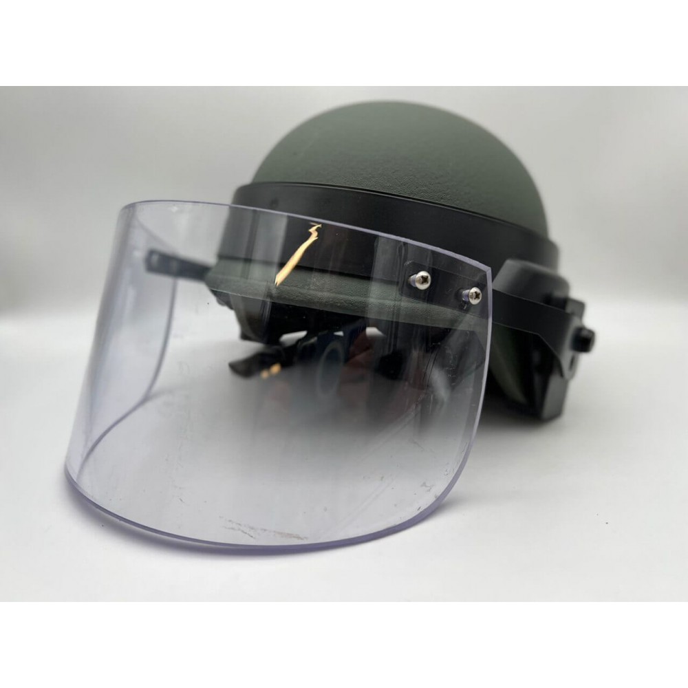 Общий вес шлема – до 1.55 кг, что позволяет длительное и комфортное ношение шлема на передовой. Забрало предназначено для защиты лица военнослужащего или сотрудника силовых структур от осколков мин, гранат, снарядов и других поражающих элементов.