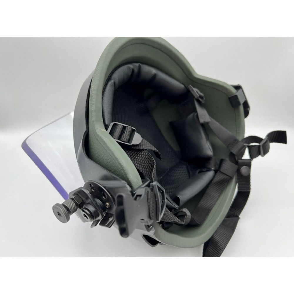 Защитный шлем изготовлен из композитного материала на основе 19 слоев арамида и СВМПЭ со специальной пропиткой фенольными смолами. Забрало защищает от попадания пистолетных пуль и осколков. Соответствует классу защиты NIJ IIIA. Толщина защитного экрана – 8 мм.